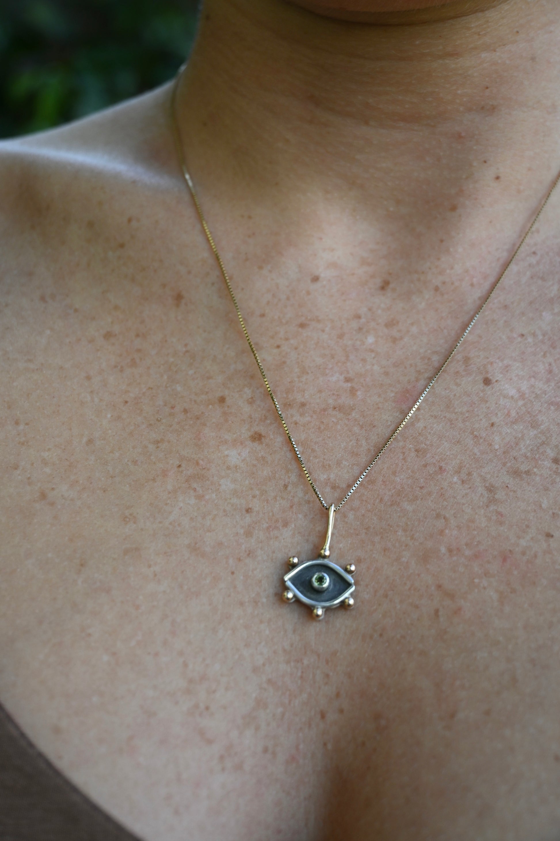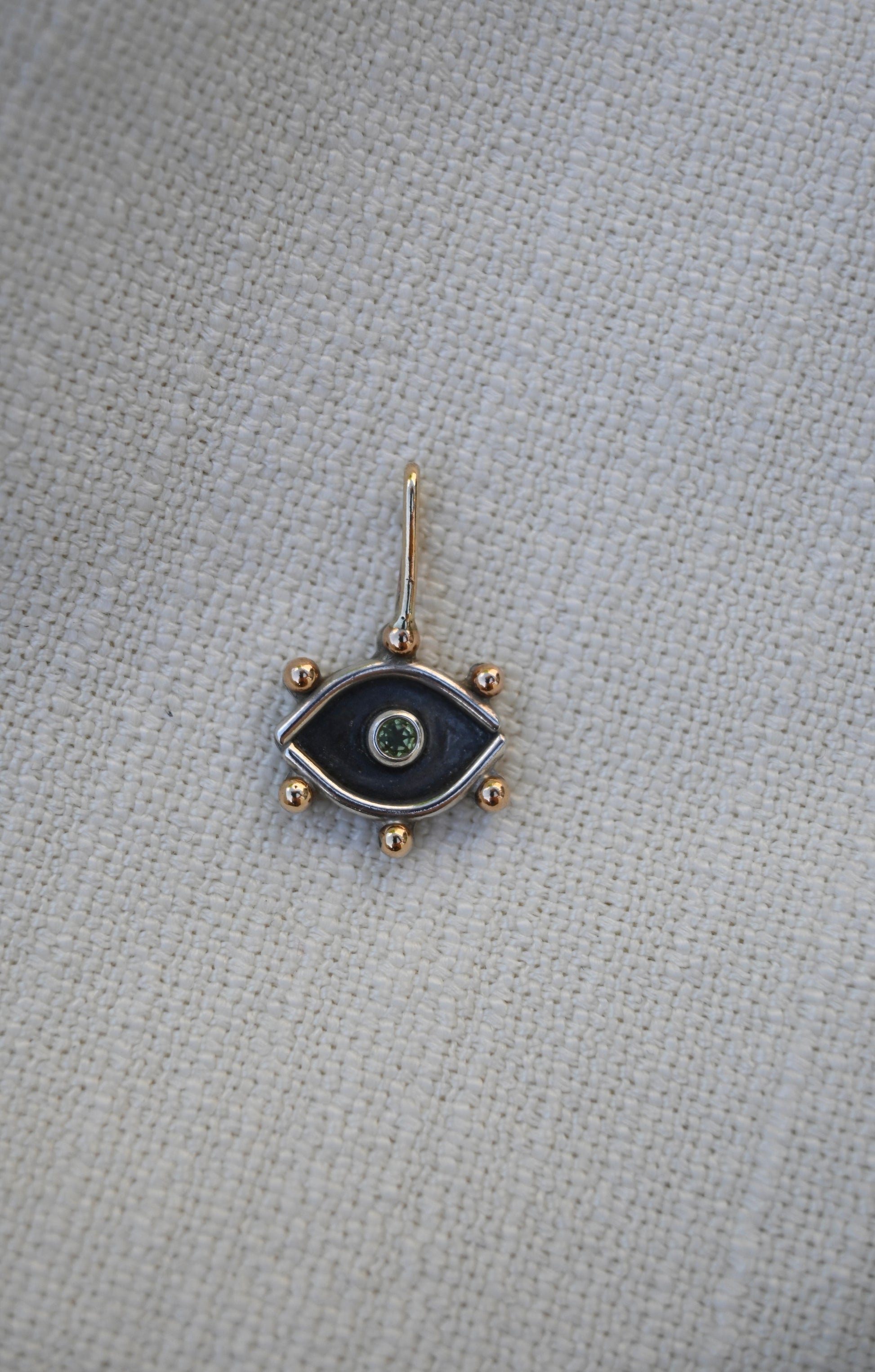 This little evil eye pendant features Sterling Silver and Jewelers Brass. In the center is a lovely 3mm Peridot gem.